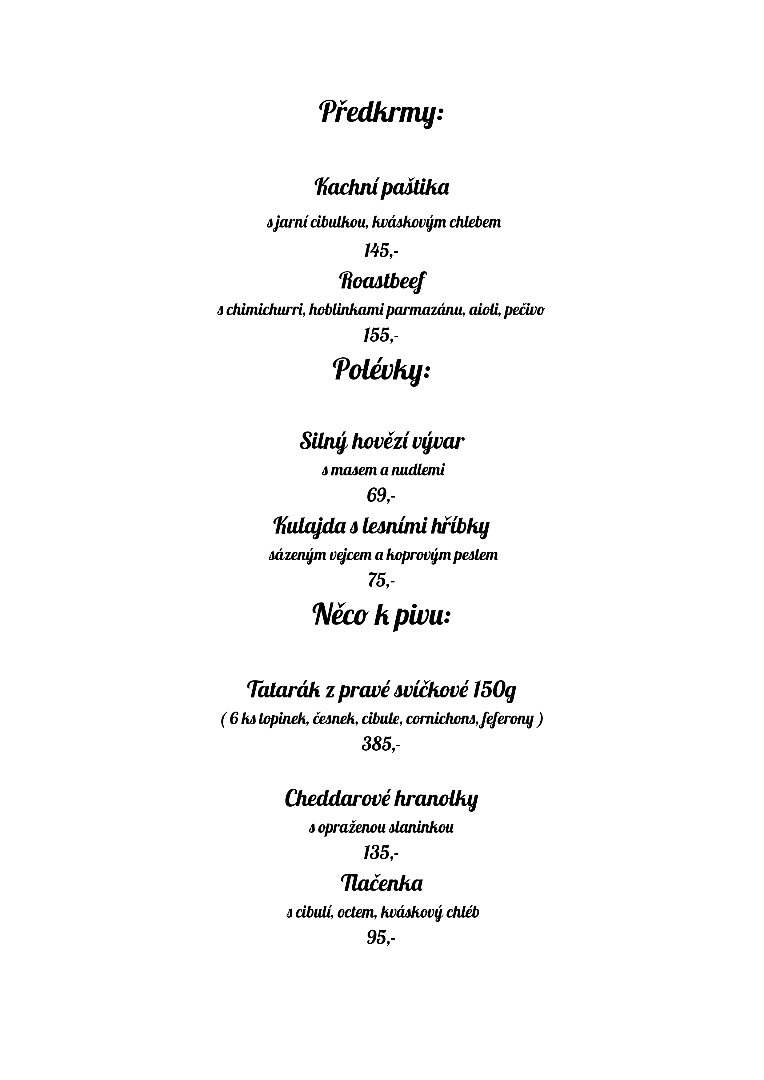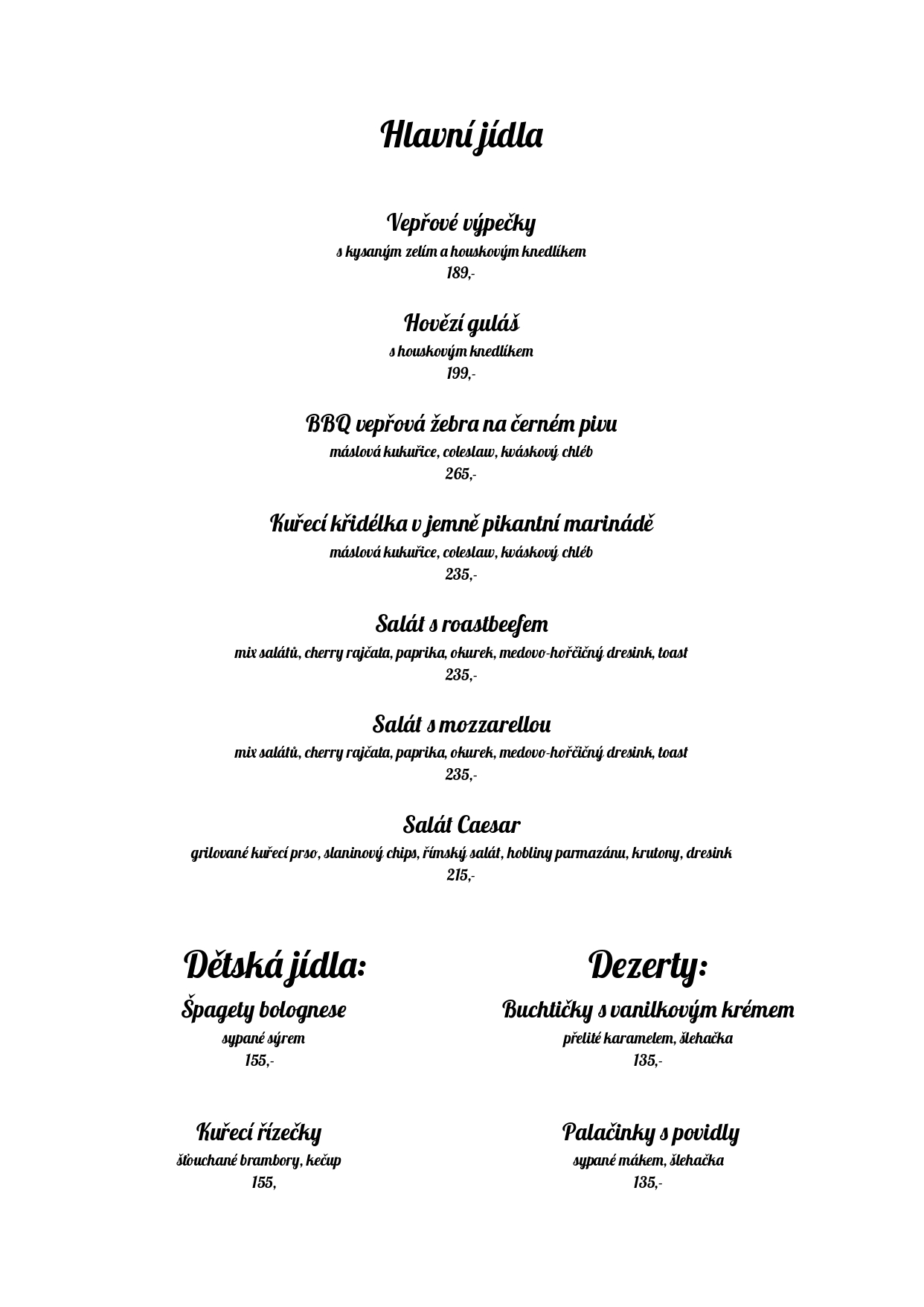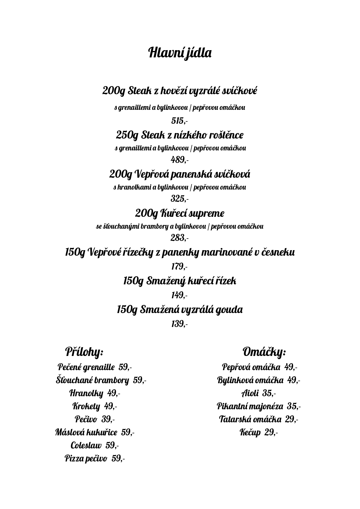 Náš jídelní lístek je pestrou kombinací tradiční české kuchyně a italské pizzy. Hlavní specialitou je neapolská pizza, připravovaná dle originální receptury z pečlivě vybraných surovin. Milovníci klasických chutí ocení poctivá česká jídla založená na osvědčených receptech a sytých porcích. Nabídku doplňují také kvalitní steaky, připravované s maximálním důrazem na správnou úpravu a chuť masa.